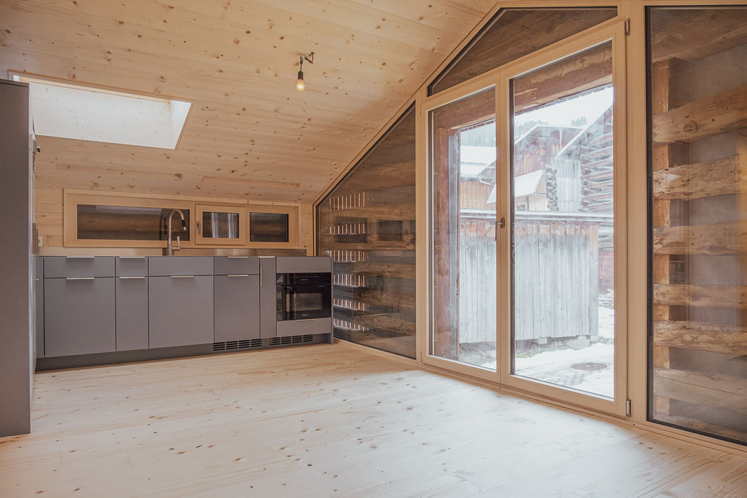 In Lumbrein entsteht ein harmonisches Refugium durch die geschickte Verbindung von altem Haus und umgebautem Stall, der neu als Studiowohnung dient.