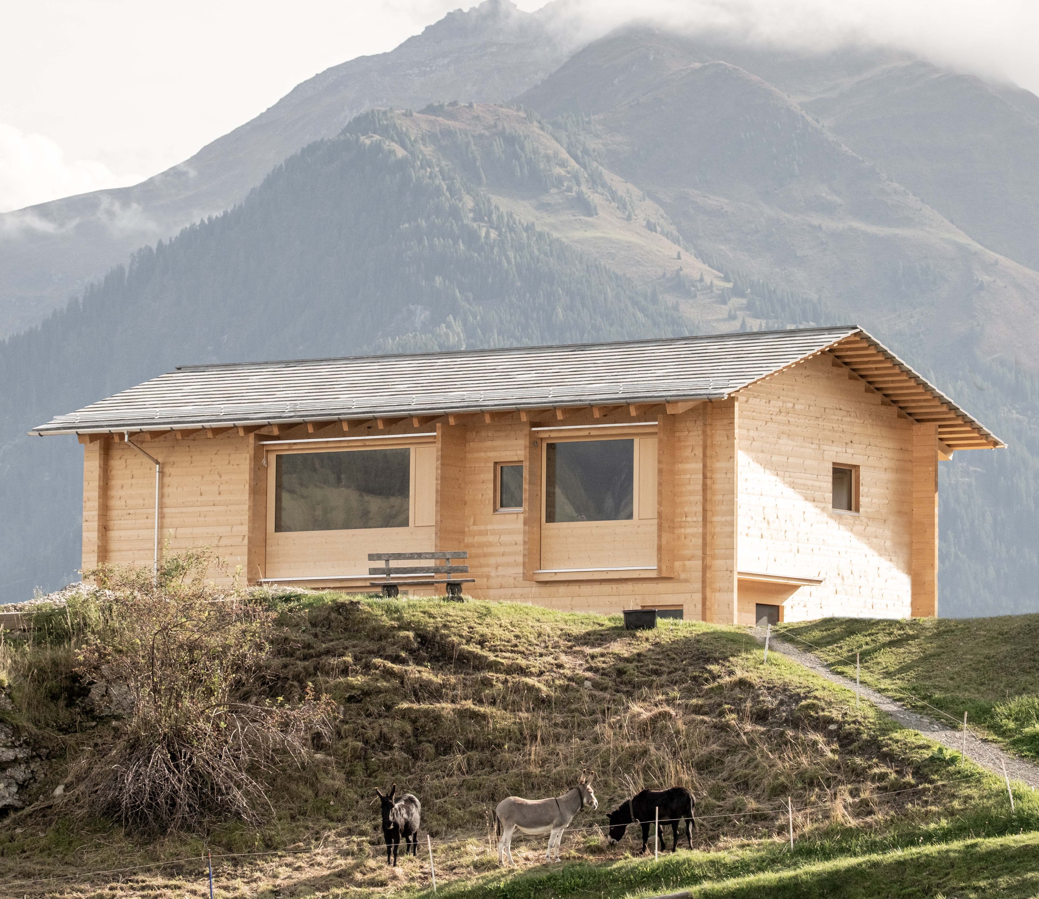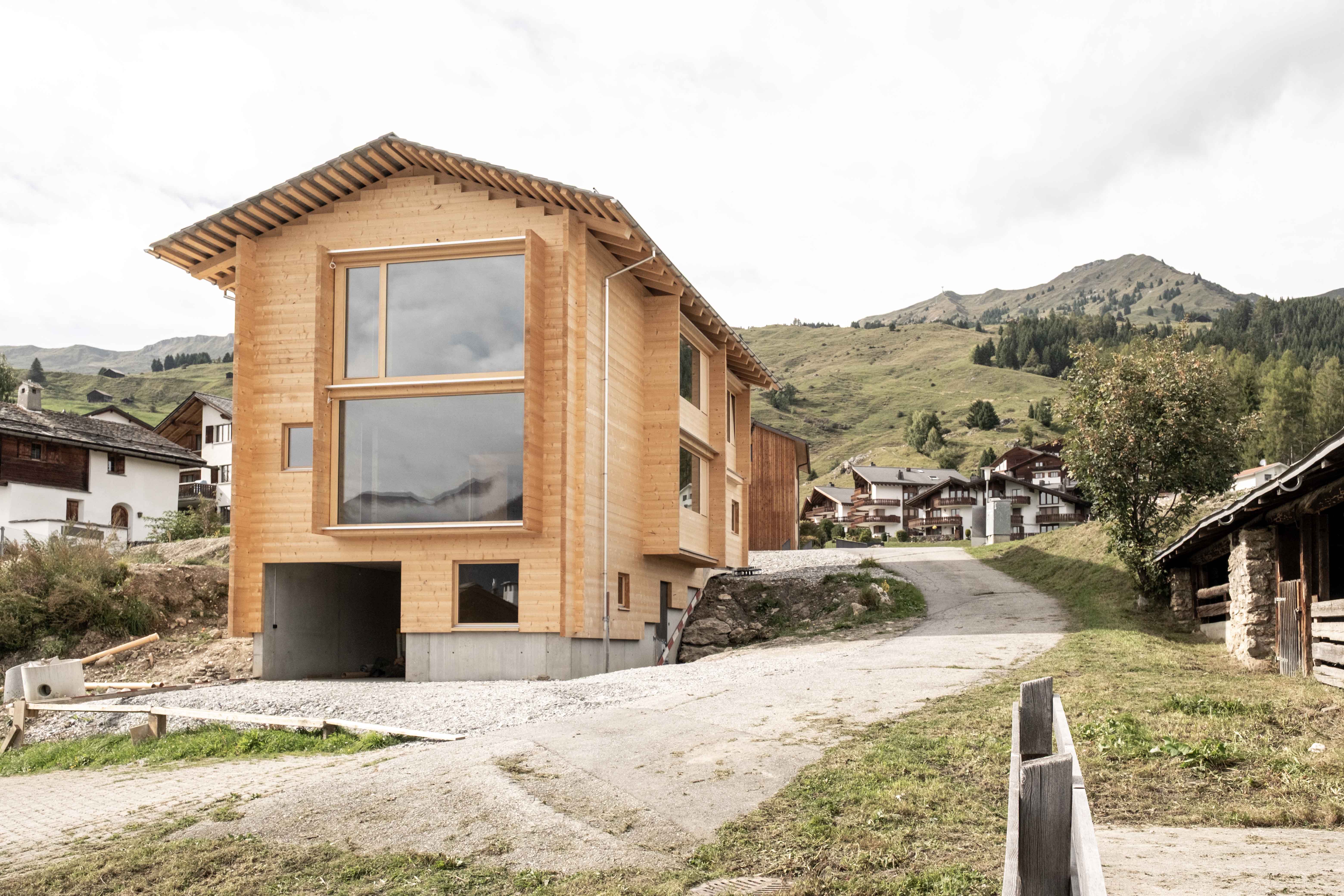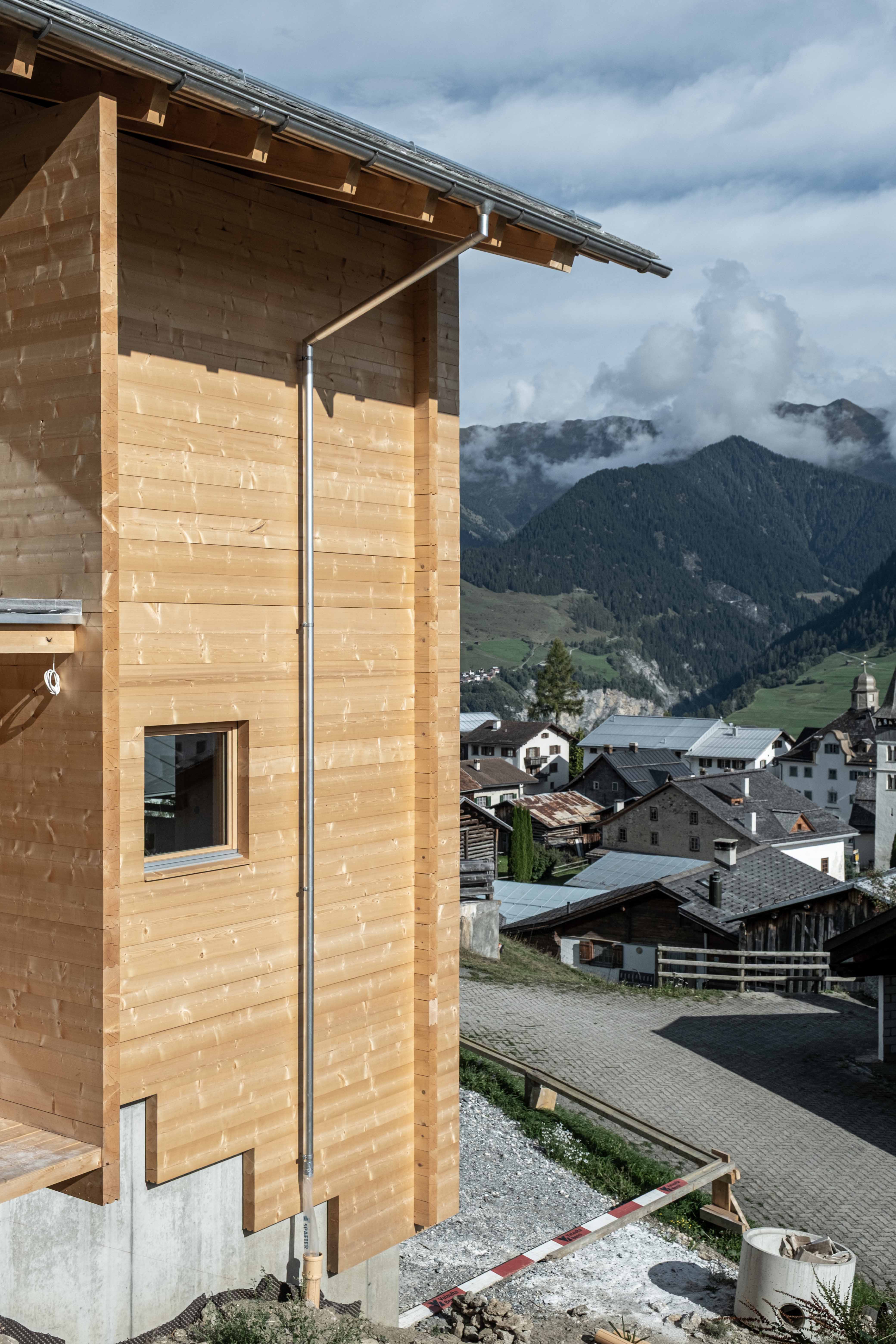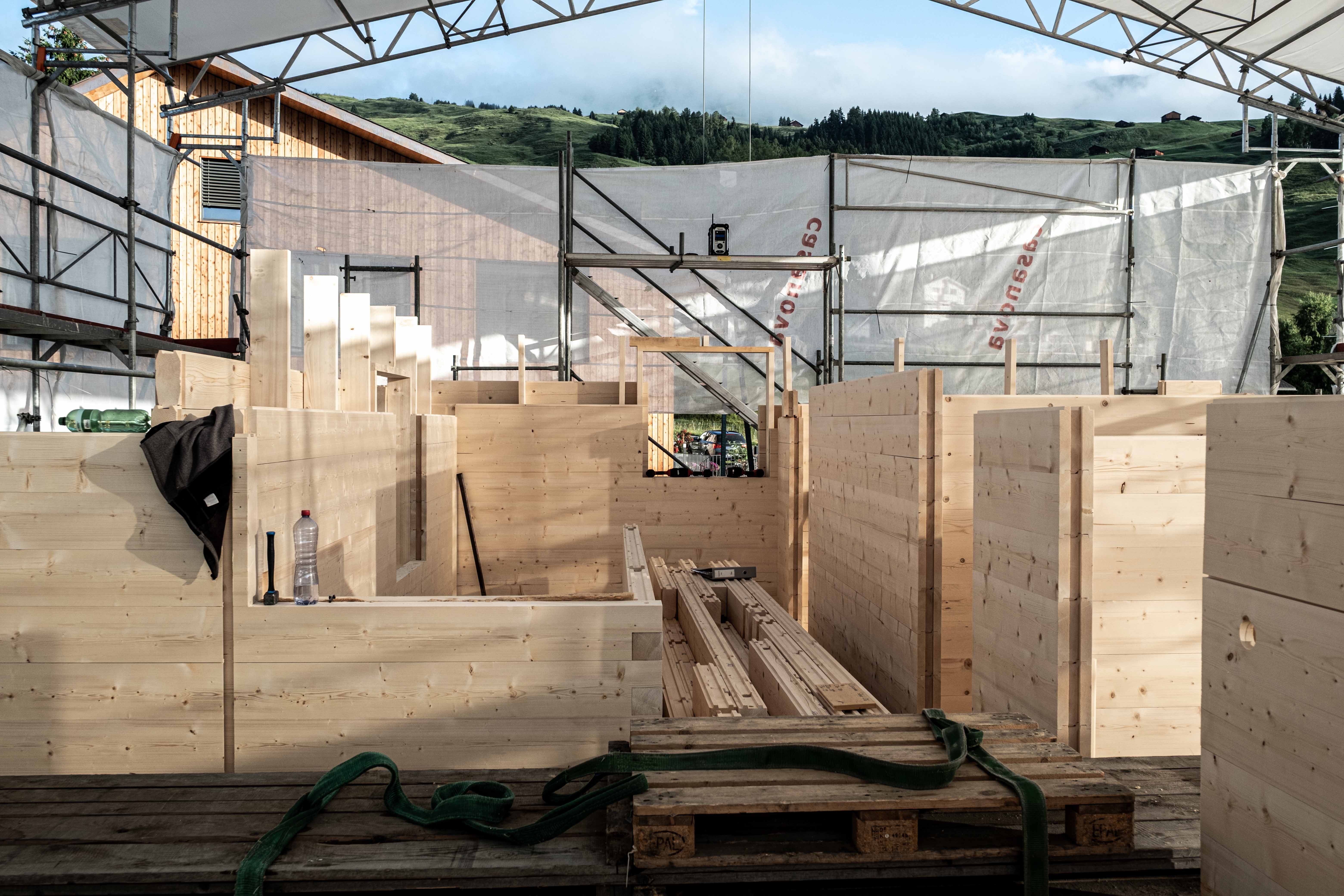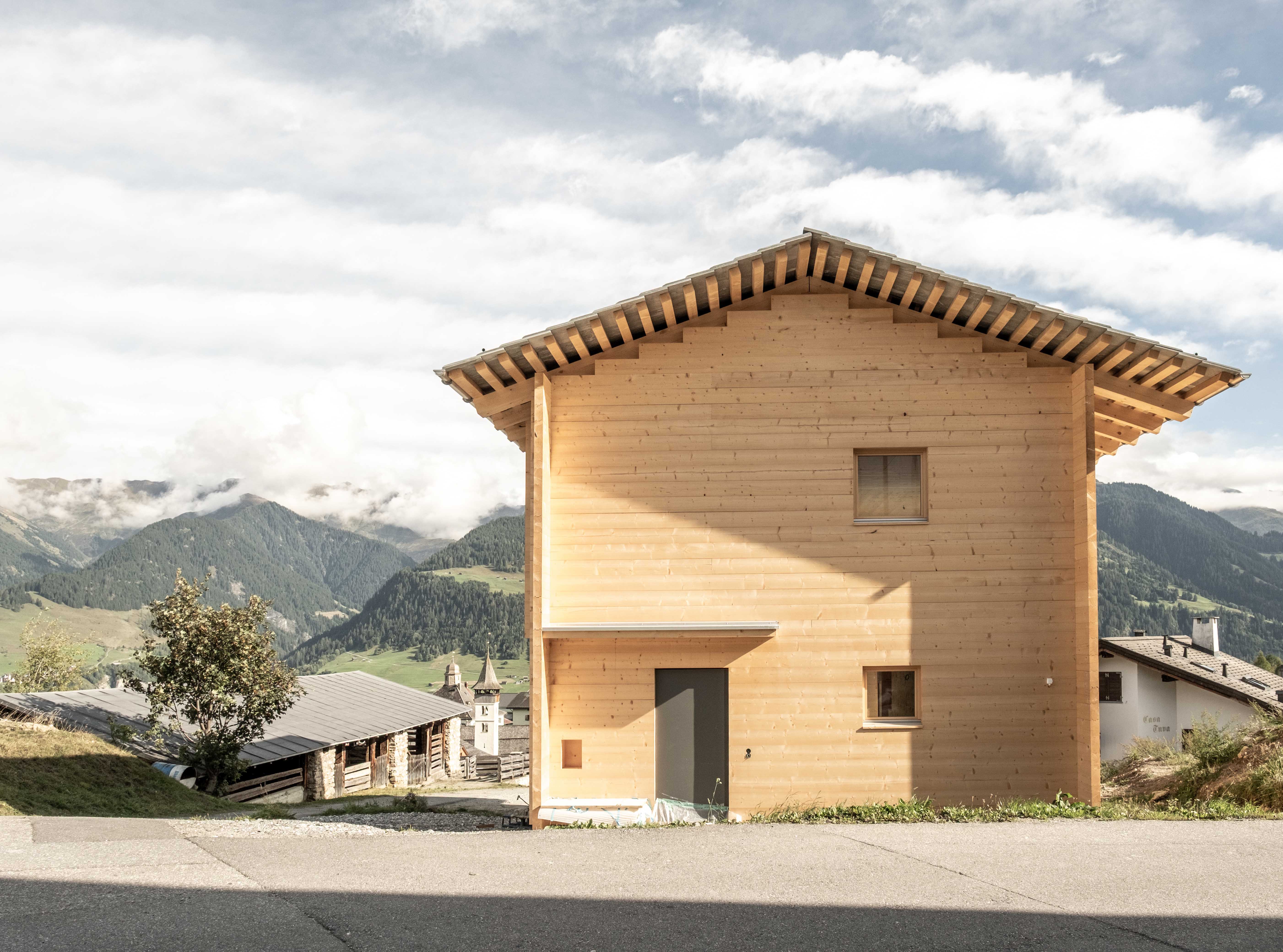 Das neue Einfamilienhaus CasaNova interpretiert das traditionelle Strickbausystem der Region in zeitgemässer Form. Aufbauend auf überlieferte Handwerkstechniken werden die Holzbalken präzise zu einem Doppelstrick gefügt (verstrickt), der ausschliesslich aus Lagen von Holz, Zelluloseisolierung und einer weiteren Lage von Holzbalken besteht – ganz ohne Folien oder zusätzliche Schichten.
