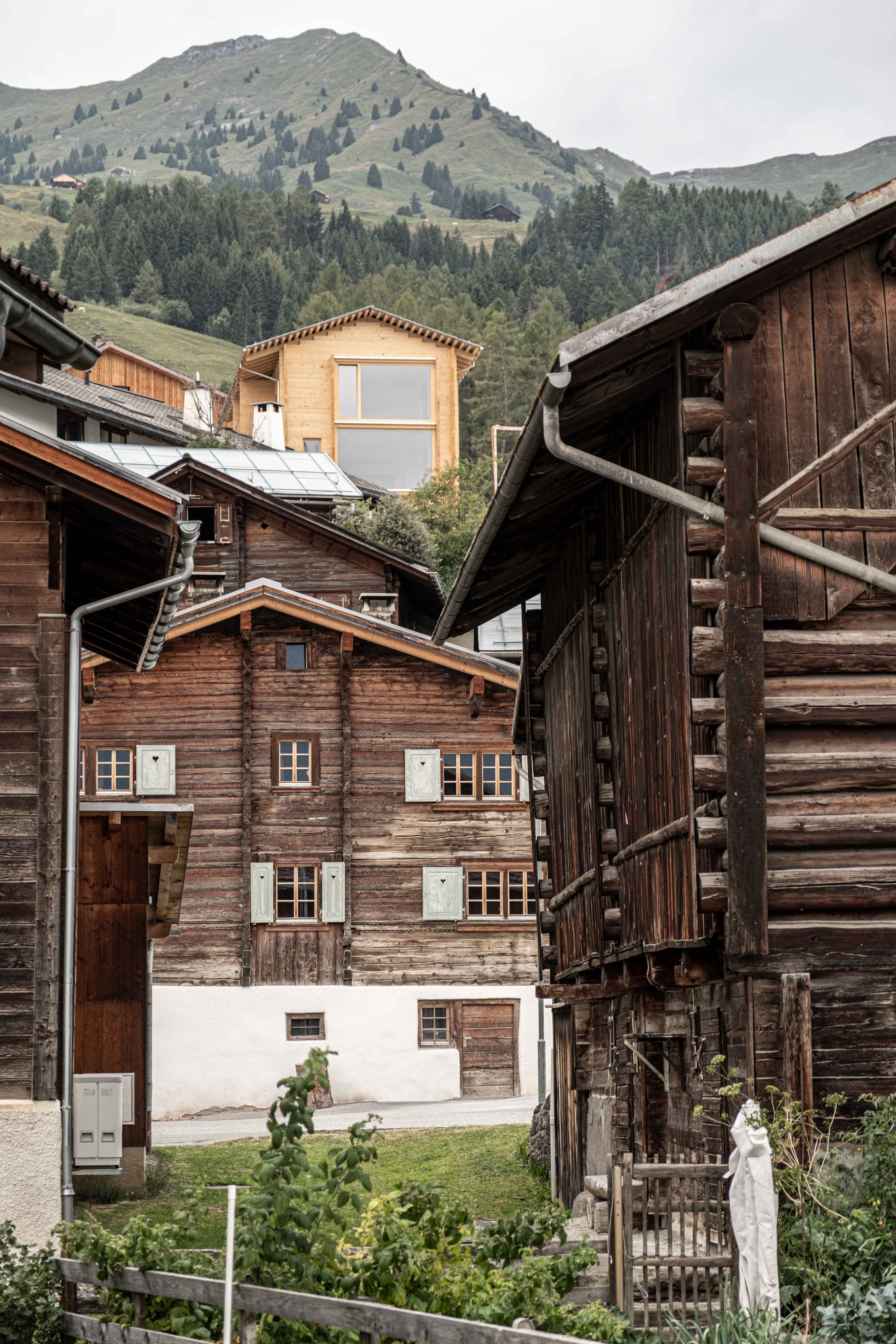 Grosszügige Verglasungen öffnen das Haus zum Dorf und zur Berglandschaft, bringen Licht ins Innere und verbinden Architektur und Umgebung.